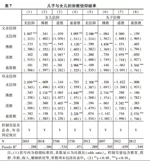 既有研究显示,父母的宗教性可能对儿子和女儿产生不同影响。因此表7分别考察了儿子与女儿的宗教继承模式。首先,从整体来看,父亲和母亲对儿子的影响力都大过他们对女儿的影响力。西方文献通常认为女儿更容易接受父母的宗教影响,因为在社会化的过程中,女儿被期待扮演更顺从、更温和的性别角色,而儿子则扮演更自我和反叛的角色(Feather, 1980)。但笔者认为,在考察儿子与女儿的角色差别时,我们需要回到具体的、历史的社会文化环境中。在闽南传统文化中,儿子需要参与祭祀与家族事务,父母会格外关注他们的宗教认同。儿子与女儿不仅要面对社会设定的抽象角色,也要面对所处社会的具体期待。