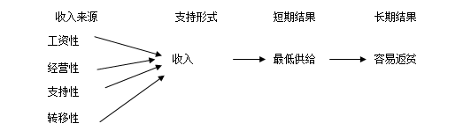 农村贫困人口的收入来源主要包括四个方面:工资性收入、经营性收入、转移性收入和社会支持性收入。政府以收入扶持为目的的转移支付,使贫困人口在短期内可以维持生计。但是由于其收入来源的脆弱性,从长期来讲,这些贫困人口返贫风险较大,见图1。我国贫困地区贫困人口的生计模式较为单一。贫困人口主要以老年人、残疾人、儿童等为主,而这些群体的就业能力普遍较低,加上农村本来就业机会就较少,因此就业并不是这些群体收入主要来源。与普通农户相比,贫困地区农村贫困人口对传统种植业的依赖性更大。农村贫困人口依然以传统农业为主,以粮食为主的种植业是贫困人口保障温饱的基础产业,种植业收入是农村贫困人口主要收入来源。政府通过最低生活保障制度对于农村贫困人口的转移性支付也是其收入的一个重要来源。除此之外,农村贫困人口从亲戚以及社会力量方面获得一些支持性收入,但这部分收入不稳定,而且数量也较少。
